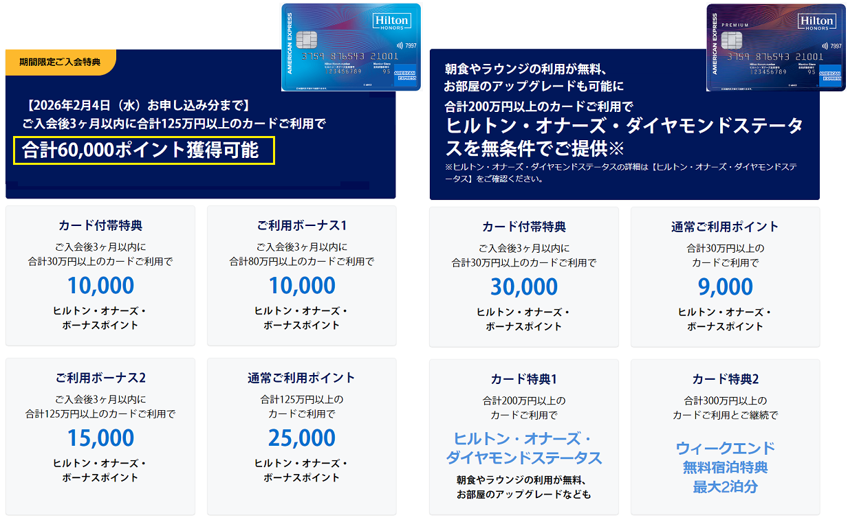 2025年11月7日より、ヒルトンアメックスで合計60,000ポイント、ヒルトンアメックスプレミアムでは合計39,000ポイントを獲得できるキャンペーンが展開されています。