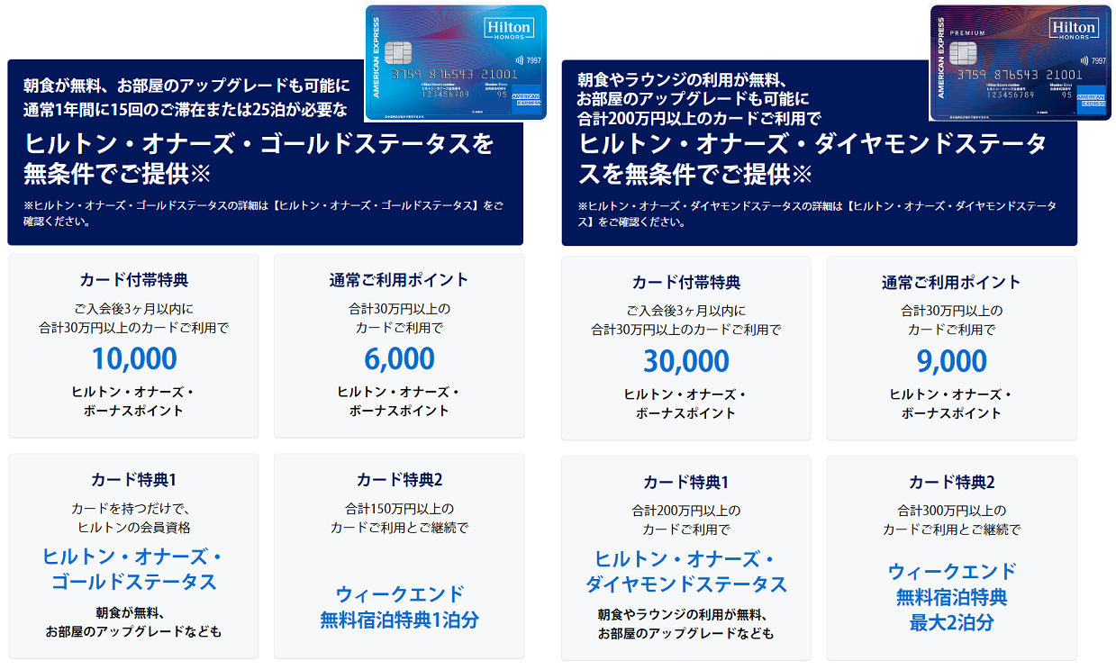 - 1月から12月の1年間で合計200万円以上利用するとヒルトン・オナーズ・ダイヤモンドステータスを提供