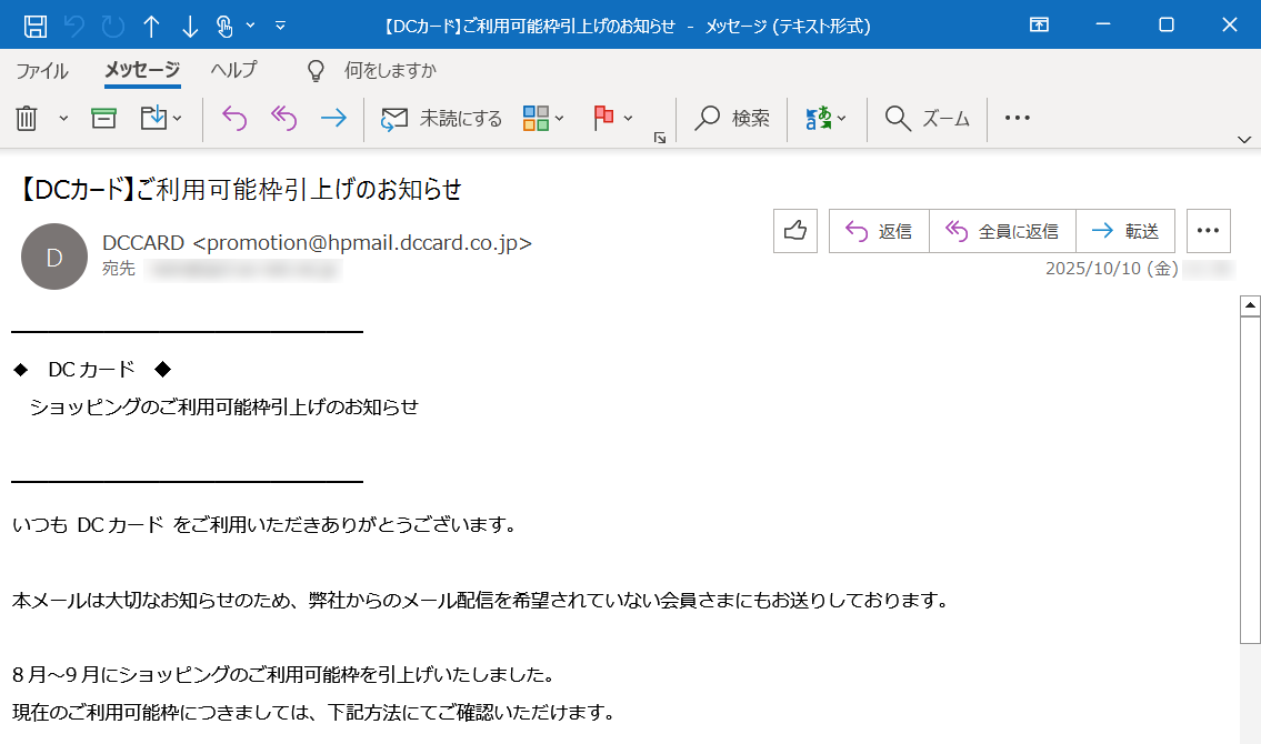 ということで、最後の?DC webサービスへログインしてみると、派手なポップアップ表示から「ショッピングのご利用可能枠引上げのお知らせ」なる案内が表れました。