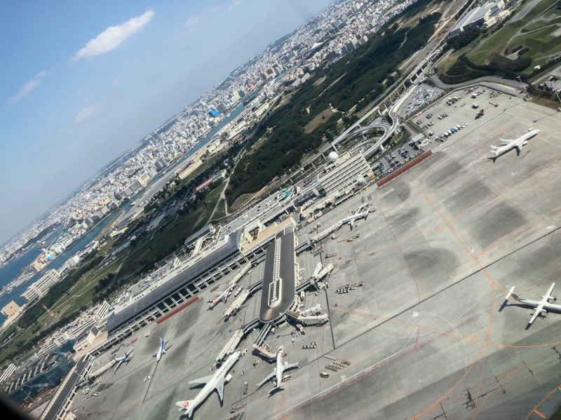 搭乗まではスムーズもタキシング後からテイクオフまでの時間が長かった。民間機や自衛隊機などが入り乱れる那覇空港ではよくあることではありますが、離着陸の混雑から離陸の順番待ちで約1時間近く滑走路前で待機することに。